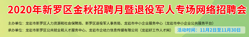 主辦單位:龍巖市新羅區(qū)人力資源和社會(huì)保障局、新羅區(qū)退役軍人事務(wù)局、龍巖市中小企業(yè)服務(wù)中心(龍巖市中小企業(yè)公共服務(wù)平臺(tái))