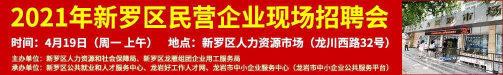 為了服務(wù)新羅區(qū)民營企業(yè)的用工需求,促進(jìn)進(jìn)城務(wù)工人員就業(yè),穩(wěn)定就業(yè)形勢,新羅區(qū)人力資源和社會保障局、新羅區(qū)龍雁組團(tuán)企業(yè)用工服務(wù)局?jǐn)M舉辦“2021年新羅區(qū)民營企業(yè)現(xiàn)場招聘會”。一、活動時間:2021年4月19日(星期一 上午8:30-12:00)