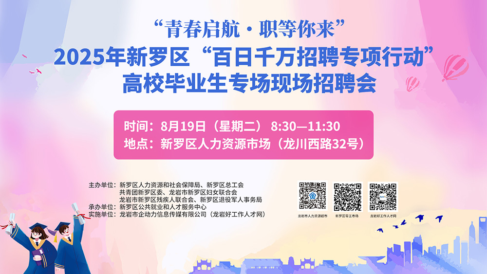 舉辦單位:新羅區(qū)人力資源和社會保障局、新羅區(qū)總工會、共青團新羅區(qū)委、龍巖市新羅區(qū)婦女聯(lián)合會、龍巖市新羅區(qū)殘疾人聯(lián)合會、新羅區(qū)退役軍人事務(wù)局