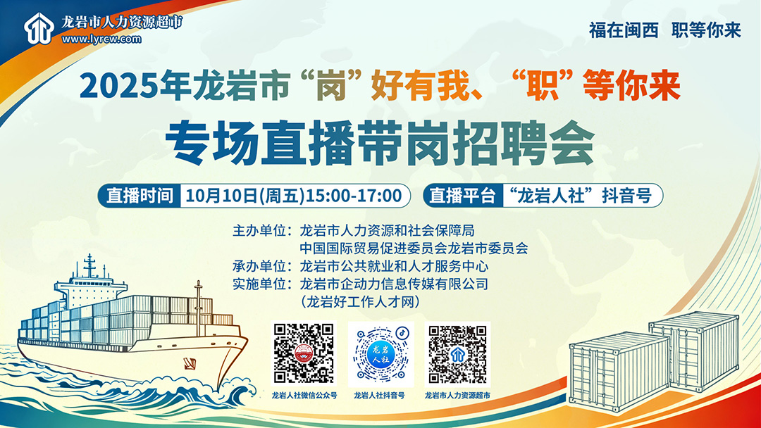 舉辦地點:直播地點:龍巖市人力資源超市(閩西交易城A6幢三層) 直播平臺:“龍巖人社”抖音號