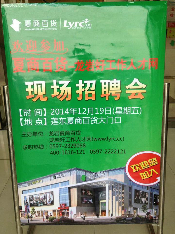 為了更好的滿足企業(yè)的用工需求,為企業(yè)和求職者搭建供需平臺(tái),夏商百貨、龍巖好工作人才網(wǎng)定于2014年12月19日(星期五)在龍巖夏商百貨正大門舉辦2014年招聘會(huì)。