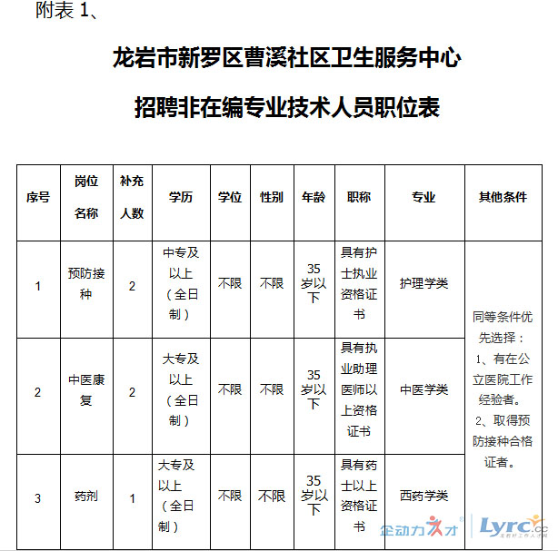 附表1:龍巖市新羅區(qū)曹溪社區(qū)衛(wèi)生服務(wù)中心招聘非在編專業(yè)技術(shù)人員職位表(點(diǎn)擊下載)