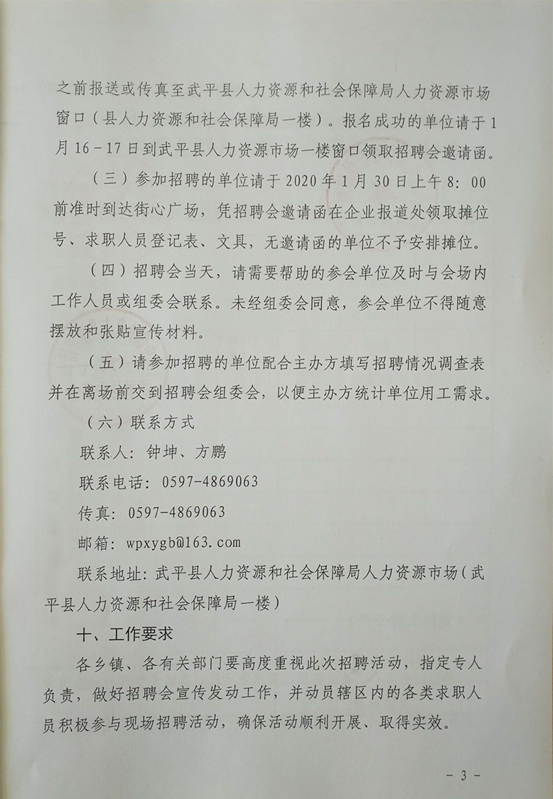 (二)參加招聘的單位需填寫好《武平縣2020年“就業(yè)扶貧-春風行動”暨春季大型人力資源招聘會報名表》,同時準備好1份本單位的《營業(yè)執(zhí)照》復印件,于2020年1月15日之前報送或傳真至武平縣人力資源和社會保障局人力資源市場窗口(縣人力資源和社會保障局一樓)。報名成功的單位請于1月16-17日到武平縣人力資源市場一樓窗口領取招聘會邀請函。