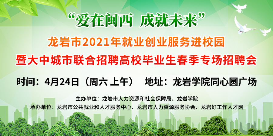 【4月24日學(xué)院招聘會】龍巖市2021年就業(yè)創(chuàng)業(yè)服務(wù)進(jìn)校園暨大中城市聯(lián)合招聘高校畢業(yè)生春季專場招聘會
