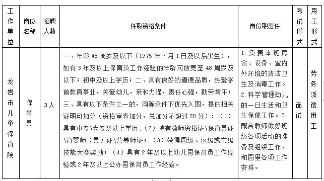 (一)聘用:體檢合格的應聘人員,與龍巖市人力資源服務有限公司簽訂勞動合同,再派遣至龍巖市兒童保育院工作。