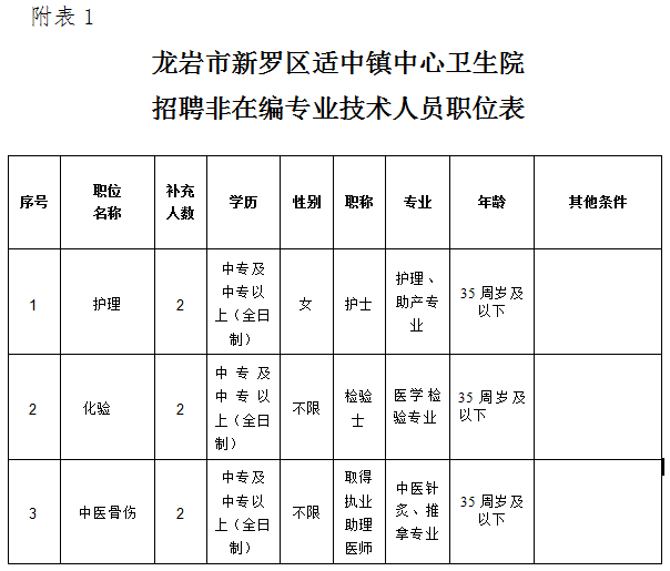 附件:龍巖市新羅區(qū)適中鎮(zhèn)中心衛(wèi)生院招聘非在編專業(yè)技術人員職位表
