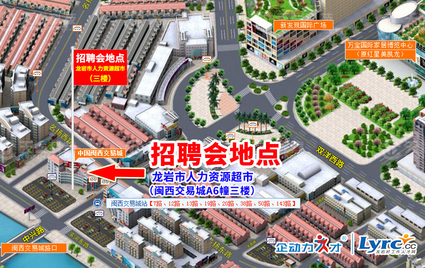 公交車線路:7路、12路、13路、19路、20路、30路、38路、50路、105路,閩西交易城站,下車右拐即到。詳情請(qǐng)?jiān)L問龍巖市人力資源超市網(wǎng)站(www.lyrcw.com)