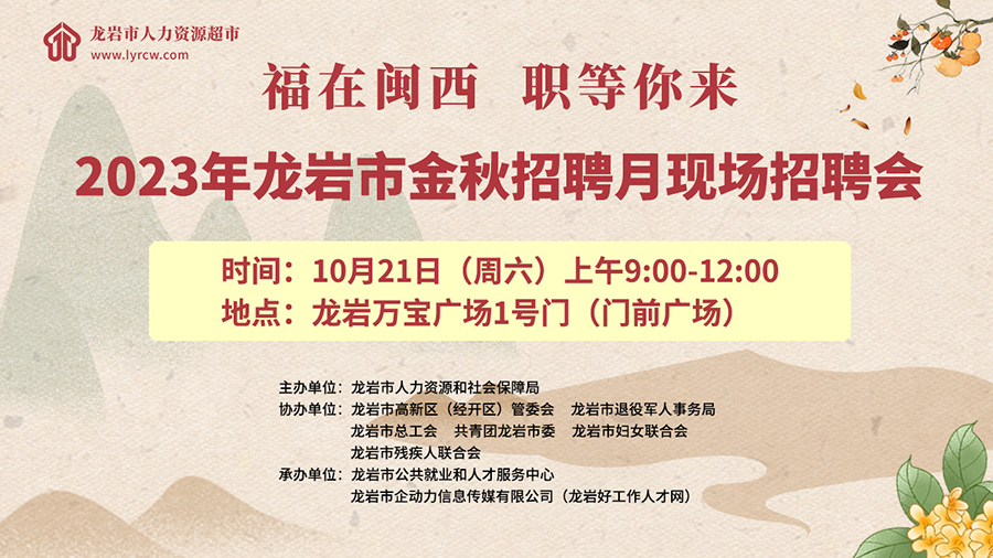 為貫徹黨中央、國務院關于穩(wěn)就業(yè)和促進民營經(jīng)濟發(fā)展壯大的決策部署,推進高質(zhì)量充分就業(yè),幫助各類企業(yè)招工穩(wěn)崗,搭建我市企業(yè)與求職者的供需對接平臺,結(jié)合2023年金秋招聘月活動主題,龍巖市人力資源和社會保障局定于10月21日上午在萬寶廣場舉辦“福在閩西 職等你來”2023年龍巖市金秋招聘月現(xiàn)場招聘會。